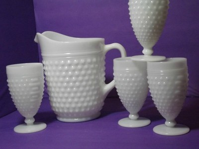 Title (ebay affiliate link): Vintage Anchor Hocking White Milk Glass Hobnail Pitcher and Four Glasses
