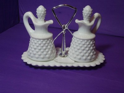 Title (ebay affiliate link): Vintage Fenton White Milk Glass Hobnail Oil Bottles and Holder