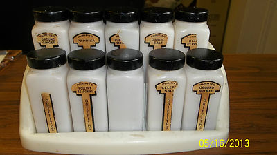 Title (ebay affiliate link): VINTAGE MILK GLASS GRIFFITH'S SPICE RACK WITH 10 JARS AND LIDS BLACK AND WHITE