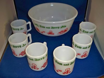 TOM AND JERRY 6 PC HOLIDAY PUNCH BOWL SET - HAZEL ATLAS WHITE MILK GLASS