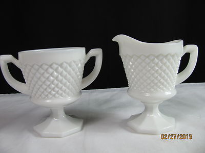 Title (ebay affiliate link): Vtg Westmoreland English Diamond Hobnail Milk Glass Cream Creamer Sugar labels