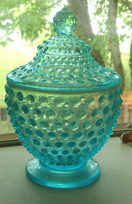 BLUE HOBNAIL COMPOTE W/LID MILK GLASS EDGE NM