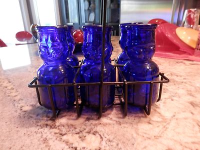 SET OF 6 VINTAGE COBALT FACE MILK JUGS IN IRON HOLDER