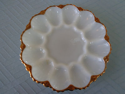 Title (ebay affiliate link): NEAT~Anchor Hocking Fireking Milk white glass~DEVILED EGG PLATTER~gold trim