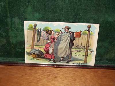 Title (ebay affiliate link): 1912 J. J. MARKS "COMIC" "MAN TALKING TO GAL WHILE SHE HANGS WASH OUT TO DRY!!!"