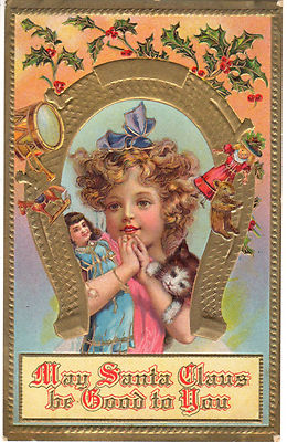 Title (ebay affiliate link): ca.1910 embossed postcard- May Santa Claus Be Good to You. Girl w/kitten & doll