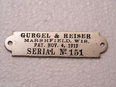 Vintage Gurgel & Heiser Marshfield WI 1919 brass nameplate saw dust conveying