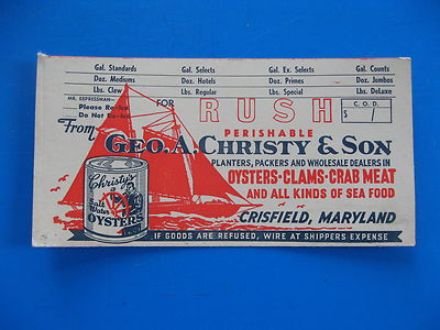 GEO. CHRISTY & SON BRAND OYSTER TIN SHELLSTOCK SHIPPING TAG,CRISFIELD, MARYLAND