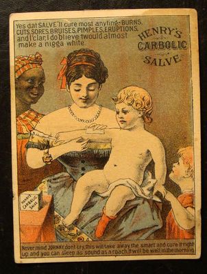 Title (ebay affiliate link): 1800's TRADE CARD-BLACK MAMMY-HENRY'S CARBOLIC SALVE-MAKES A NIGGA WHITE