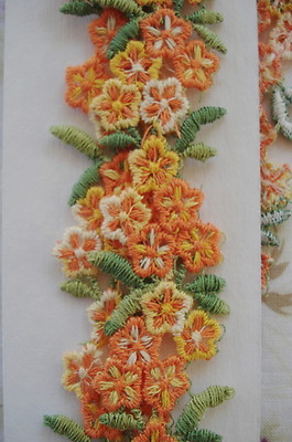 Title (ebay affiliate link): VINTAGE SCHIFFLI EMBROIDERED ORNG FLOWER RIBBON APPLIQUE LACE TRIM ANTIQUE DOLL