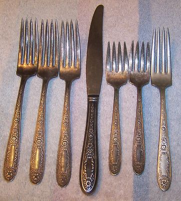 Title (ebay affiliate link): MONARCH MILDRED SILVER PLATE 6 FORKS ( 3 SIZES ) & 1 DINNER KNIFE