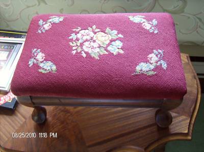 Title (ebay affiliate link): ANTIQUE VICTORIAN NEEDLEPOINT FOOT STOOL WINE FLORAL