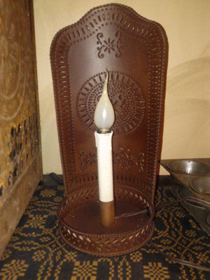 Title (ebay affiliate link): Primitive Punched Tin Burgundy Electric Light with Silicone Bulb