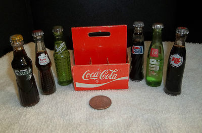 Title (ebay affiliate link): 6 Vtg.Glass Miniature 3" RC,Pepsi,Canada Dry,7UP,Sprite & Crush W/Coke Carrier