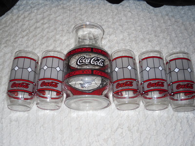 Title (ebay affiliate link): Coca Cola Coke Vintage Glassware Pitcher Set & 5 Glasses Godfathers Pizza