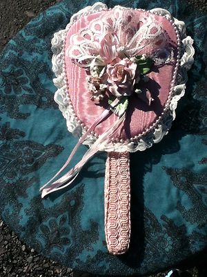 Title (ebay affiliate link): Unique Pink Capodimonte Lace and Pearl Hand Held Vanity Mirror