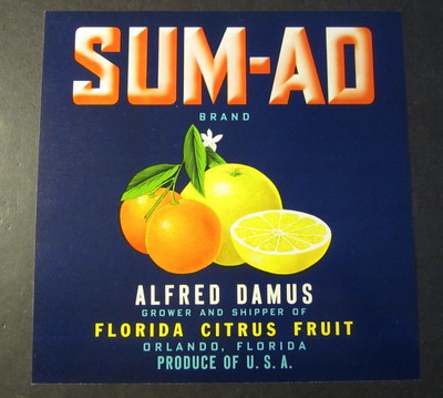 Original Old - SUM-AD - FLORIDA Citrus Crate LABEL - Alfred Damus - ORLANDO