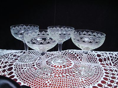 Title (ebay affiliate link): ANTIQUE ETCHED LACE CHAMPAGNE GLASSES DEPRESSION WAVY GLASS STAR BOTTOM SET 4