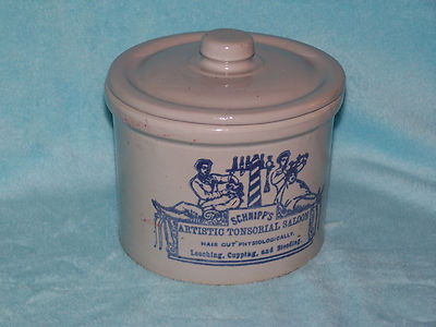 Title (ebay affiliate link): Schnipps Tonsorial Saloon Lidded Barber Shop Crock, apox 6 1/4" wide,4 1/2" tall