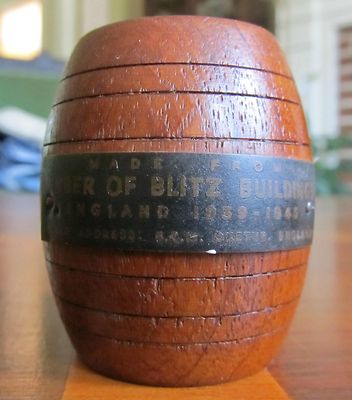 Teak Treen Barrel Match Holder from the Timber of Blitz Buildings