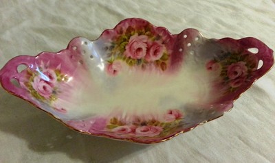 Beautiful hand painted Pink Rose Flower Bowl Oval Flowers Antique