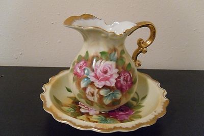 VINTAGE ENESCO HAND PAINTED WASH BASIN AND PITCHER WITH GOLD COLOR ACCESENTS