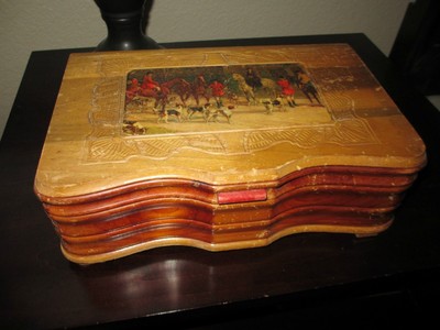 Antique Wood Dovetail Curved Box Equestrian Fox Hunting
