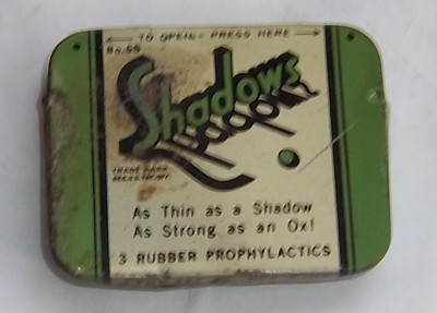 Title (ebay affiliate link): Vintage 1950s Shadows Condom Tin Prophylactics Wrapper 3 - .35 cents