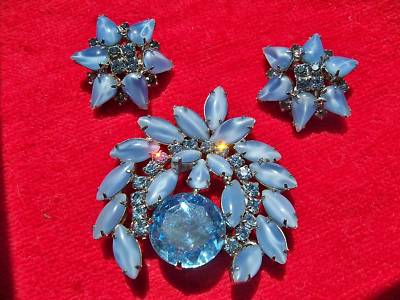 Vintage RS & Milk Glass Brooch & Married Earrings BLUES