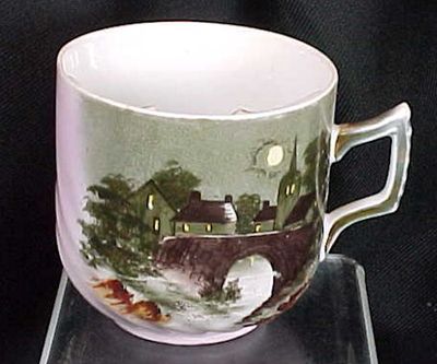 Title (ebay affiliate link): Antique Mustache Cup Hand Painted Village City Scene Church Bridge Moonlit WOW