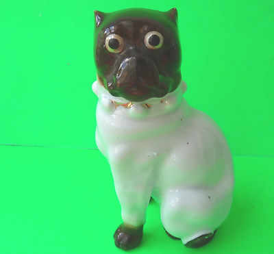 ANTIQUE GLAZED CHINA FIGURE OF A SEATED PUG DOG.