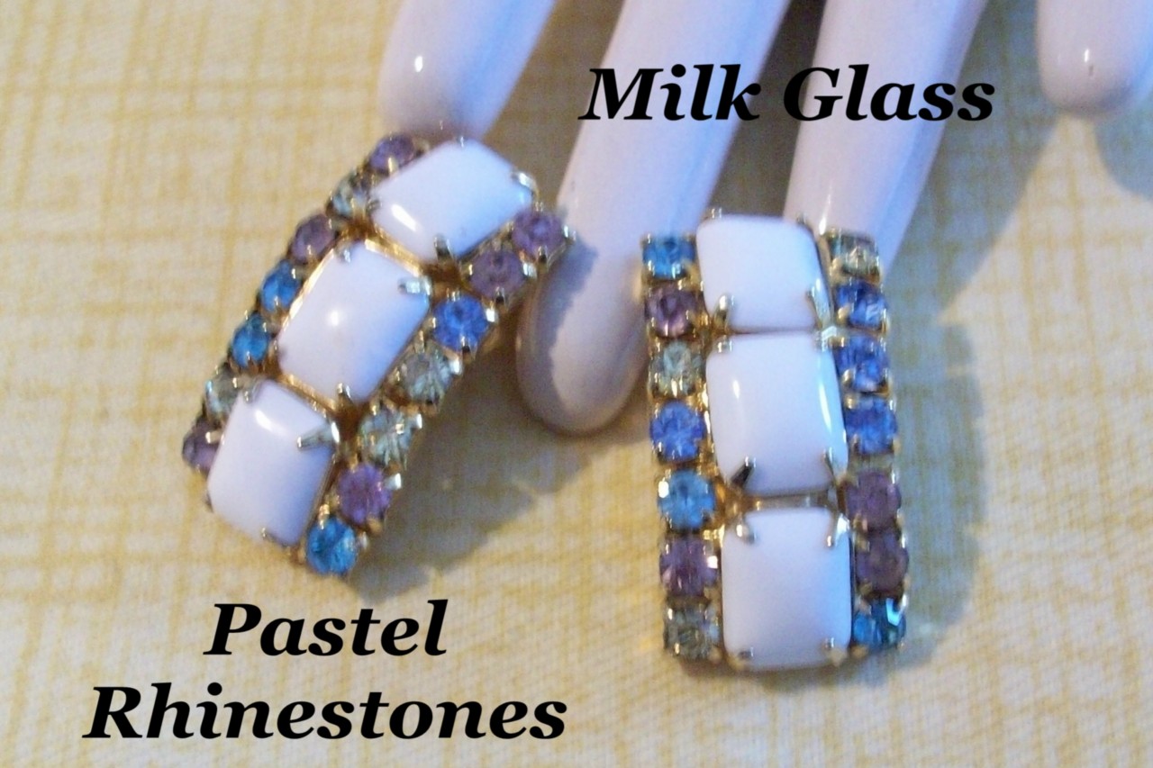 Vintage Pastel Rhinestone & Milk Glass Clip Earrings