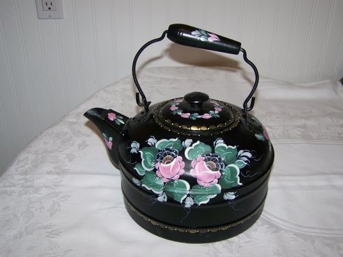 Title (ebay affiliate link): GORGEOUS VTG TOLEWARE HAND PAINTED FOLK ART PINK ROSE METAL TEA KETTLE GSW