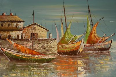 ANTIQUE FISHING VESSELS SEASCAPE OIL PAINTING - SIGNED - UNFRAMED