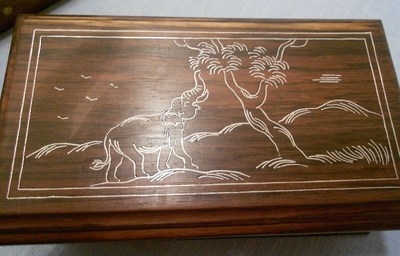Wood Box Cover Lid India Dark Wood White engraving Elephant Tree