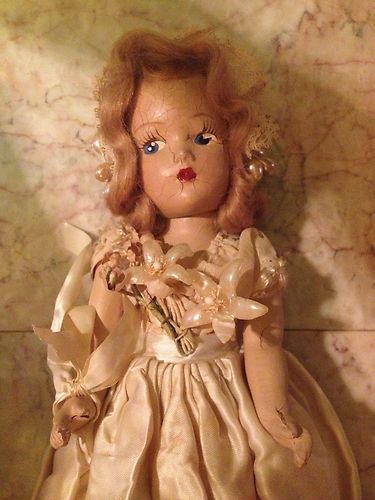 Title (ebay affiliate link): Antique Composition Bride Doll Wax Flowers Wedding Dress Day 1920's NR!