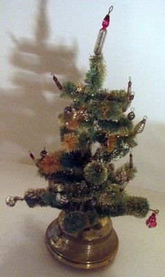Title (ebay affiliate link): Bottle Brush Christmas Tree with Glass Candles/Bells/Balls, Music Box, Vintage