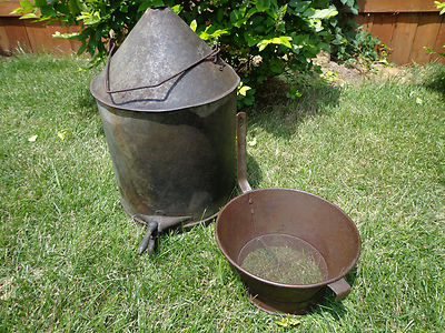 Title (ebay affiliate link): VINTAGE, ANTIQUE METAL MOONSHINE STILL / POT / STRAINER / BOILER / FARM TOOL