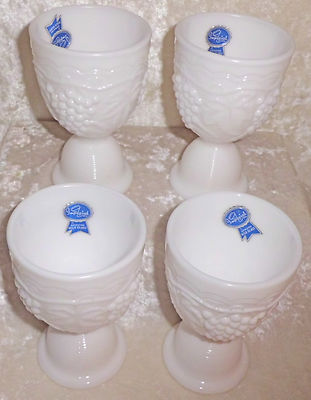 Title (ebay affiliate link): 4 VINTAGE IMPERIAL MILK GLASS GOBLETS WITH TAGS ~ RARE & USUSUAL BASE ~ MINT