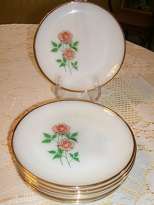 Vintage Fire-King Milk Glass Anniversary Rose Lunch Salad Dessert Plates - 8