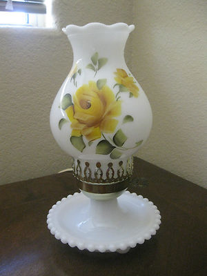 Title (ebay affiliate link): Vintage Antque Boudoir Hurricane Lamp Hand Painted Milk Glass Shade Hobnail Base