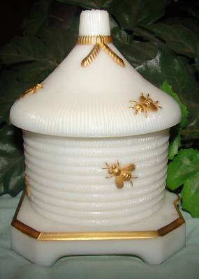 IMPERIAL Milk GLASS Gold Bees BEEHIVE HONEY POT Covered