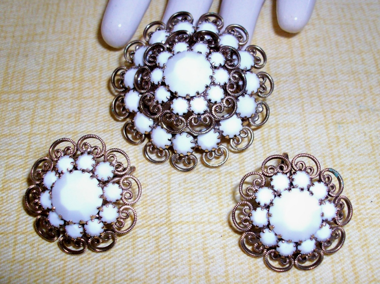 Vintage White Milk Glass & Gold Tone Pin & Earring Set