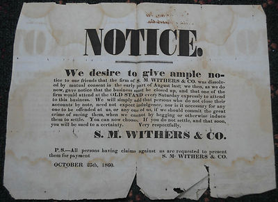 Title (ebay affiliate link): 1860 Broadside Notice Of Dissolution by S.M. Withers & Co 12" x 9 1/2"