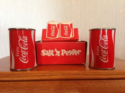 Title (ebay affiliate link): Vintage 1970s Tin Coca-Cola Salt and Pepper Shaker New In Box Free Shipping
