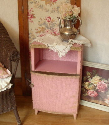 Title (ebay affiliate link): Vintage PINK Loomed/wicker NIGHTSTAND or TABLE*Shabby!