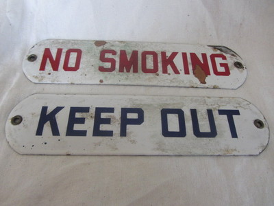2 ANTIQUE PORCELAIN DOOR SIGNS KEEP OUT & NO SMOKING. NR