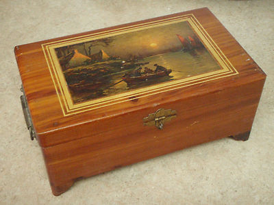Title (ebay affiliate link): Antique Cedar Wood Treasure Letter Box 6"x 10.5 x 4 3/4" Lake Cabin Boat Scene