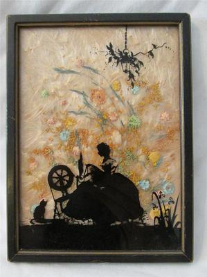 Title (ebay affiliate link): Vintage "Fisher" Framed Spinning Wheel Silhouette w/Milkweed & Flower Background