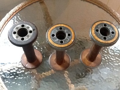 Vintage primitive Spools Bobbin spindles Wood Metal Set Of Three